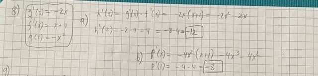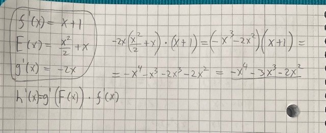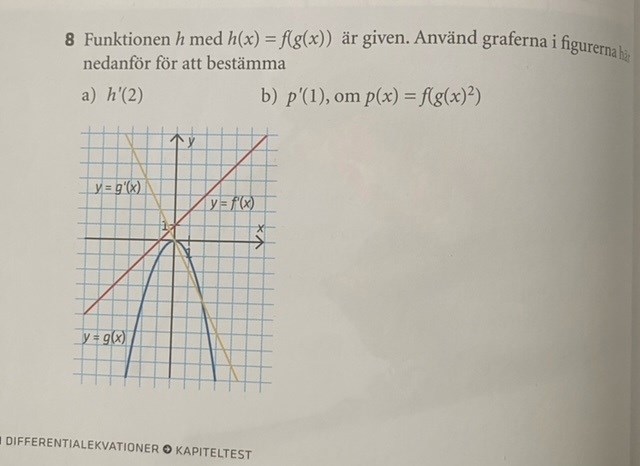 Oj, jag deriverade h(x) = g(f(x)) men i den här uppgiften hade man definierat h(x) = f(g(x)) så derivatan blir (med uppgiftens beteckningar) h'(x) = f'(g(x)).g(x). Ursäkta att jag krånglade till det!