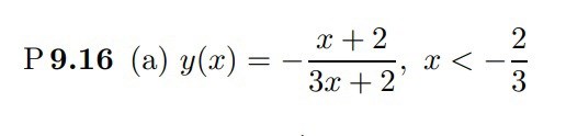och det är a-uppgiften som jag lyckas lösa ut y(x) men förstår ej varför x måste vara mindre än -2/3. Förstår att x inte kan vara lika med -2/3 men varför kan det inte vara större?