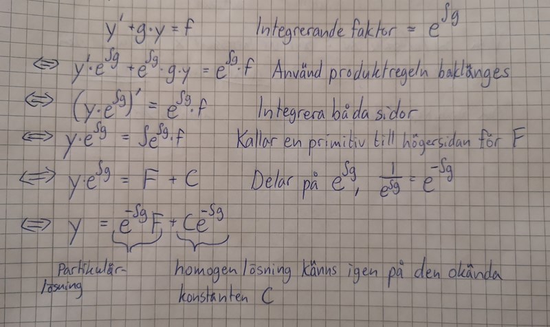 Micimacko skrev:Svarar på integrerande faktor nu, aldrig hört talas om ansättningsmetoden. Om du har y' + gy = f och löser ekvationen så ser det ut ungefär såhär