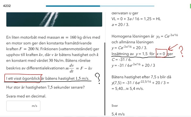 I ett visst ögonblick, när x=0 är båtens hastighet 1,5 m/s