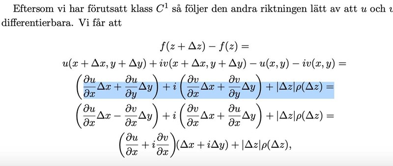 Vet att jag ska använda Cauchy-Riemanns ekvationer i sista steget men det blir samma som de har fått fram. menar sista raden som de har fått.