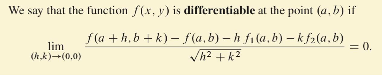 Litet ostringent här, men hf1 och kf2 går ju mot noll så f(a+h, b+k) – f(a, b) måste också gå mot noll eftersom nämnaren gör det.