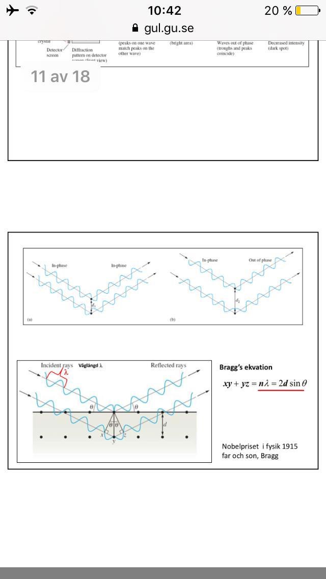 2) de utgående vågorna sprids åt alla håll. De har i figuren ritat ut en riktning på utgående vågor där man kan få konstruktiv interferens, om braggvillkoret är uppfyllt för den infallsvinkeln, våglängden och avståndet mellan planen.