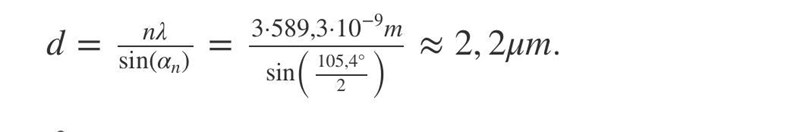 n=2,2μm0,5893μmsin(αn)≈3,7sin(αn), då sin(αn) =1 får vi att n≈4.n=2,2μm0,5893μmsin(αn)≈3,7sin(αn), då sin(αn) =1 får vi att n≈4.