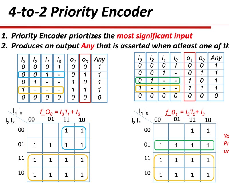 Hej, jag visste inte vem mer som skulle kunna hjälpa mig så jag hoppas på en förklaring från er! Jag är förvirrad hur man fick denna K map från Truth table, enligt mig borde den till vänster inte ha andra raden av ettor ifylld och den till höger inte de två längst upp? Samtidigt tycker jag att man skulle kunna göra en större inringning av den gröna till vänster vilket skulle förenkla uttrycket?