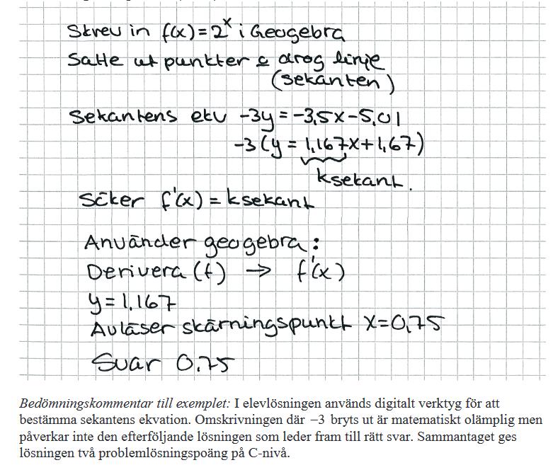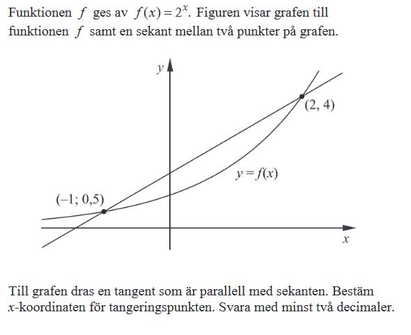 Tangenten skall vara parallell med sekanten i bilden och nudda vid funktionen (i närheten av bokstaven y i y = f(x)). Att räkna ut k-värdet för sekanten är första steget - det finns ju koordinater angivna för två punkter, så det borde vara ganska enkelt. Sedan gäller det att hitta vilket x-värde som ger en derivata med detta värde.