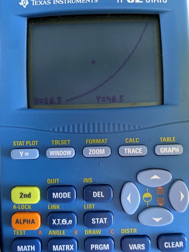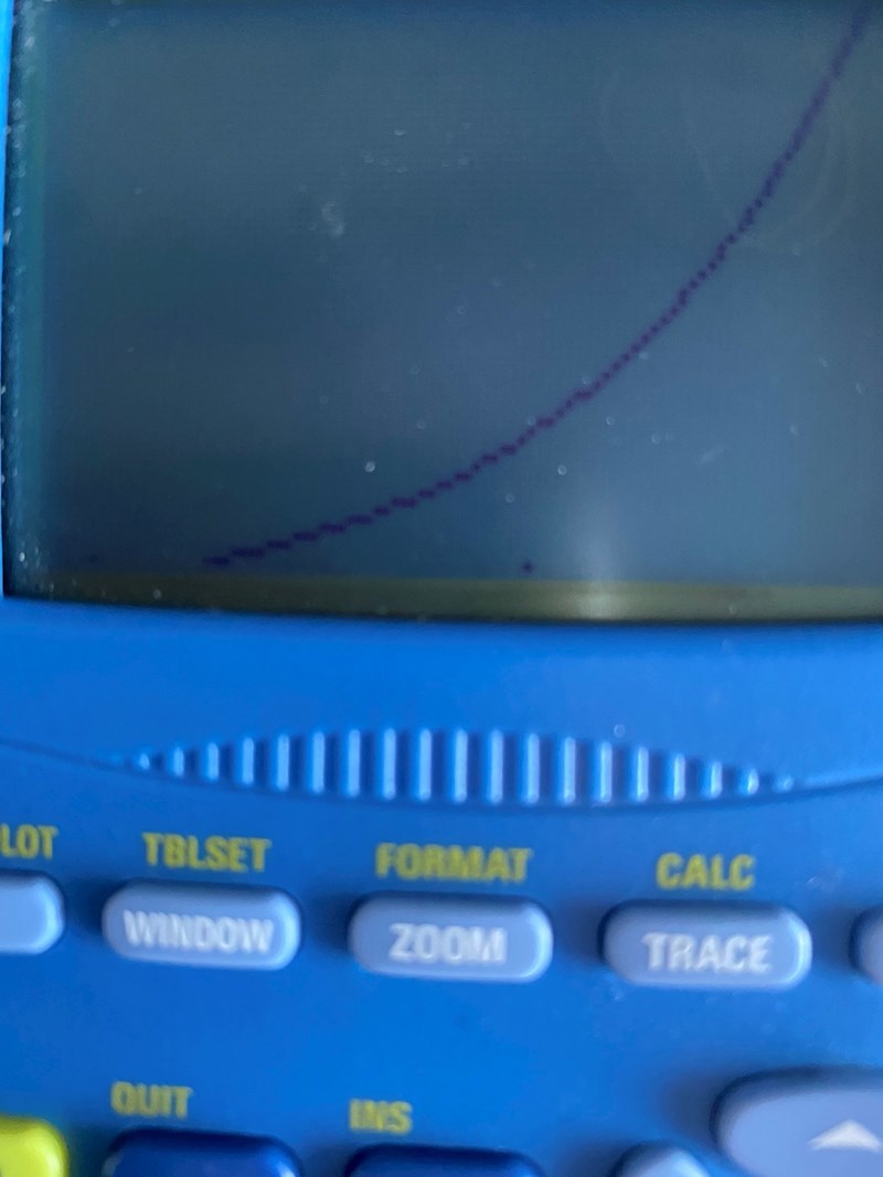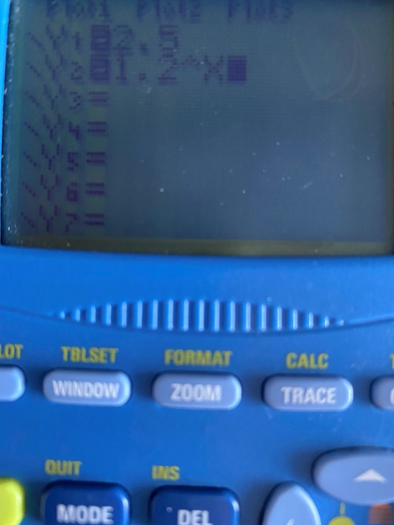 Du vill zooma så att både linjen y=2,5 och kurvan y=1,2^x syns. När du zoom:af så du ser skärningspunkten ska du försöka zooma in mera så att du kan läsa av att så exakt värde som möjligt. Jag tror att knappen "window" gör att du kan ställa in intervallet för x- och y-värden som fönstret visar.