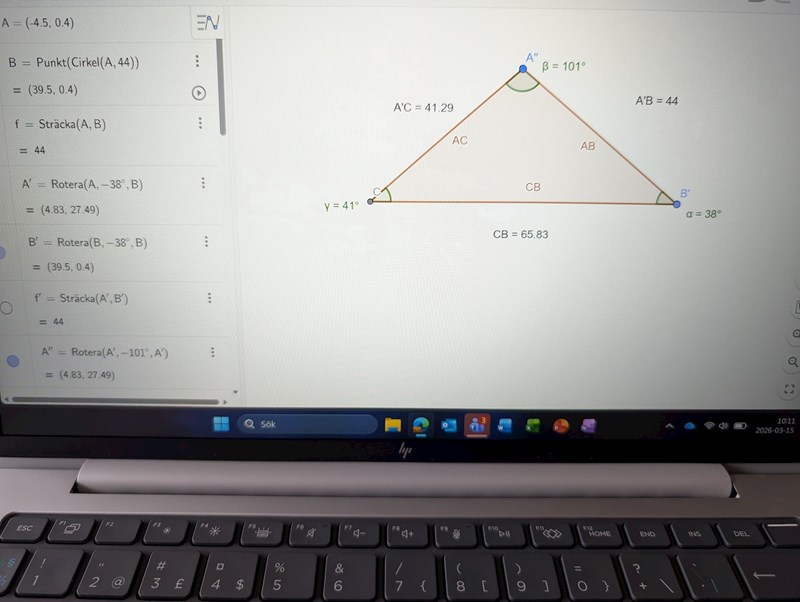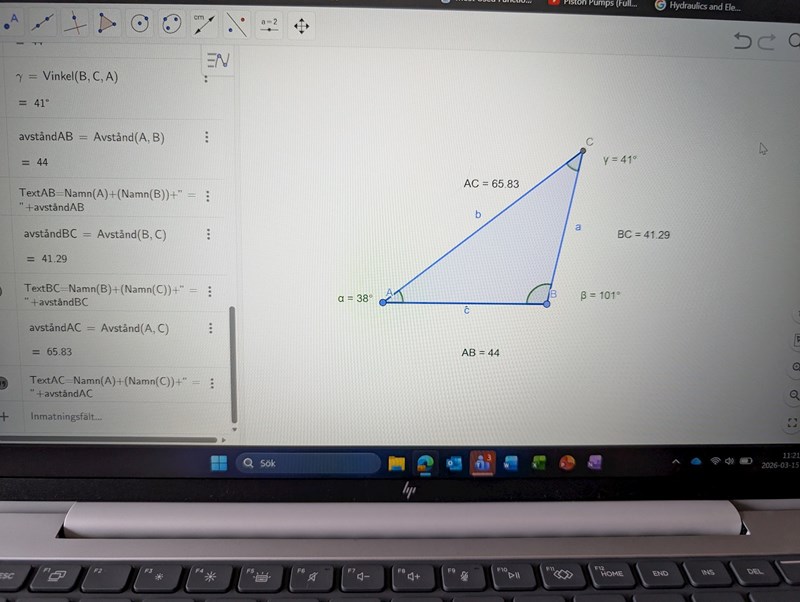 Jag lyckas i alla fall inte konstruera triangeln. Men har aldrig använt verktyget innan så har väl mer med det att göra, följer en massa instruktionsvideos och AI instruktioner men får inte till det. Får väl öva mer antar jag, försöker dra en linje ifrån en punkt och ge den en given vinkel från den punkten men verkar inte vara möjligt.