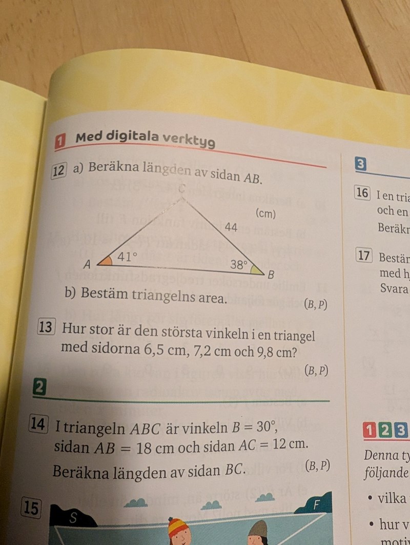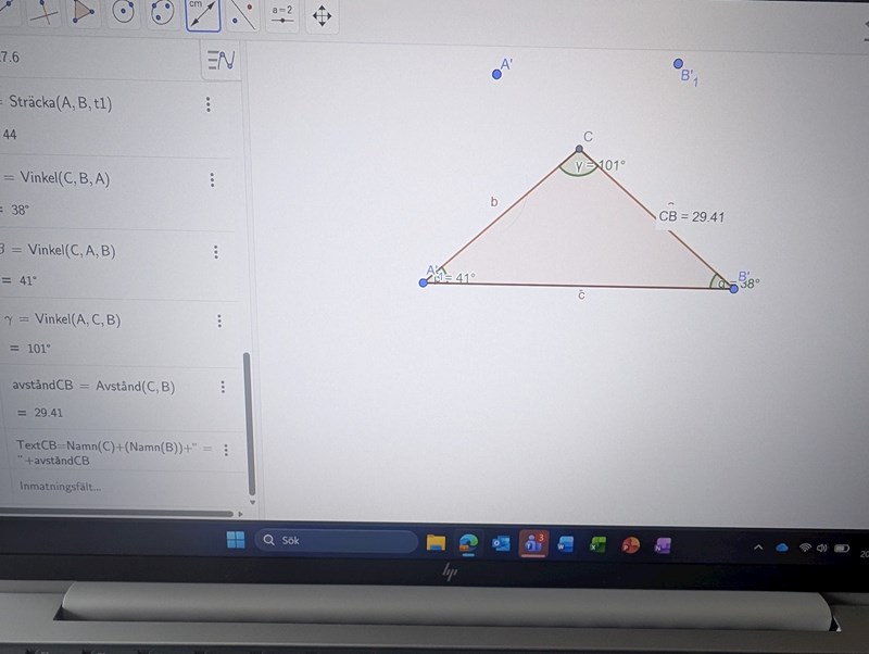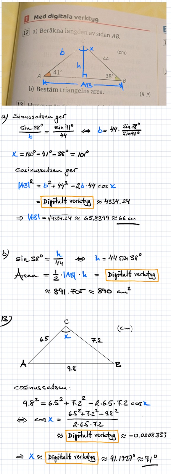 Hej, det står att uppgifterna ska lösas med digitalt verktyg. Då tänker jag att GeoGebra verkar populärt, och undrar hur jag kan lösa uppgiften med hjälp av det. Eller ska man skriva in parametrarna i en cosinus sats formel som redan är färdig eller.. ja, exakt hur löser jag det här med digitalt verktyg. Förstår inte vad man är ute efter.