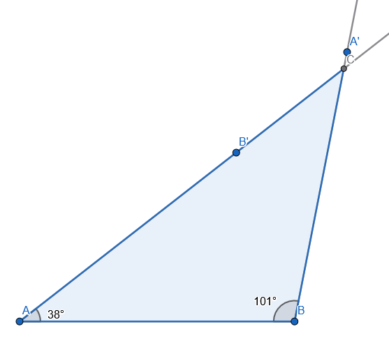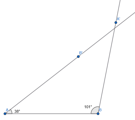 Dra en stråle från ena änden av sträckan till hjälppunkten som dykt upp när GeoGebra ritat 38-graders vinkel, dra sedan en stråle från andra änden av sträckan till hjälppunkten som dykt upp för 101-graders vinkel.