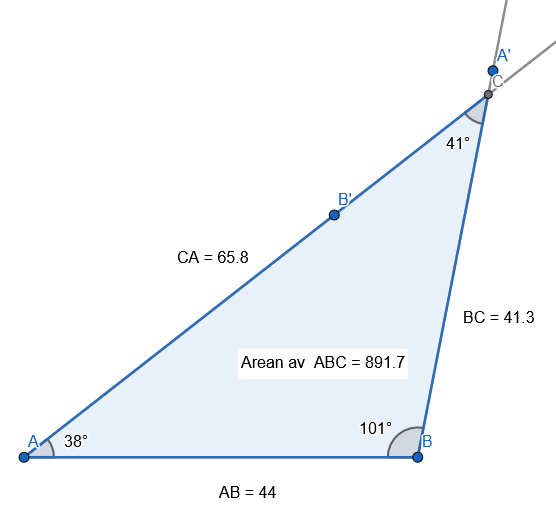 Nu har jag konstruerat den i GeoGebra och det verkar som att den inte går att konstruera med givna parametrar?? Mycket irriterande i så fall. Får vinklar 101, 39.5 och 41.. med längd 44 då..