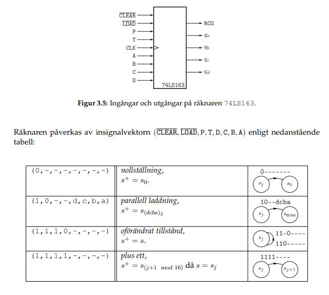 Jag har även gjort börjat på 3.5.2. Modulo-räknarna kan realiseras genom att koppla så som de skrev: (1, RCO', 1, 1, d, c, b, a) där (d, c, b, a) = (0, 1, 1, 0) dvs 6 för mod10 och (1, 1, 1, 0) dvs 14 för mod2.