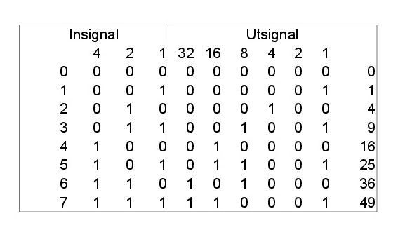 Konstruera ett nät där insignalen utgör ett trebitars binärtal och där utsignalen utgör insignalen i kvadrat (ett sexbitars binärtal).
