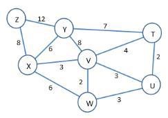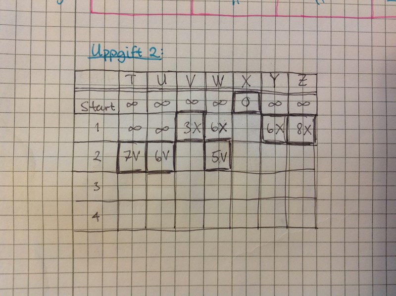 "Använd Dijkstras algoritm för att beräkna den kortaste vägen från nod X till alla andra noder i nätverket nedan.