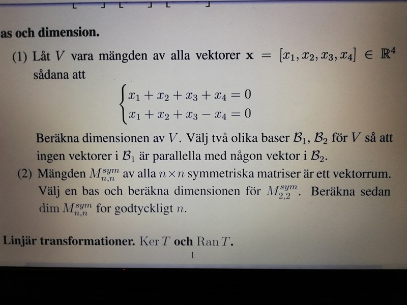 (1) Det sökta rummet V är nollrummet, ställ upp systemet på vanligt sätt och gausseliminera.