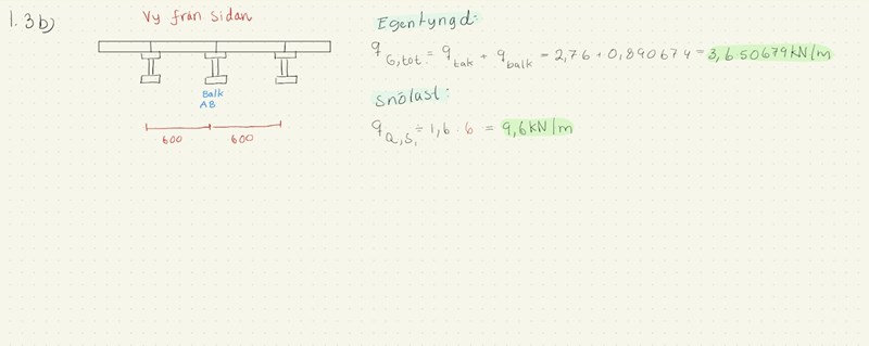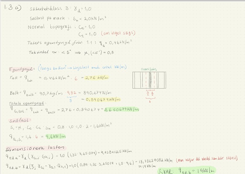 På 1.3 b) behöver jag hjälp vart jag ska ta mitt böjmoment någonstans. Hur kan jag komma vidare?