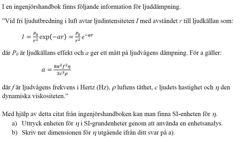 För att lösa uppgiften skulle jag ignorera den första ekvationen i uppgiften och lösa ut eta ur den andra ekvationen, därefter göra en dimensionsanalys.