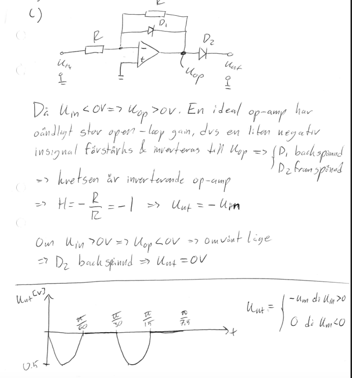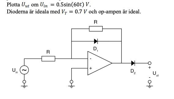 Fel 1. Som du mycket riktigt påpekade, om Uin har amplituden 0.5V och Vt = 0.7V så kommer D1 inte att bli framspänd. Kopplingen är en inverterande förstärkare om man tittar på Uin till Uop (utsignalen från OP:n).