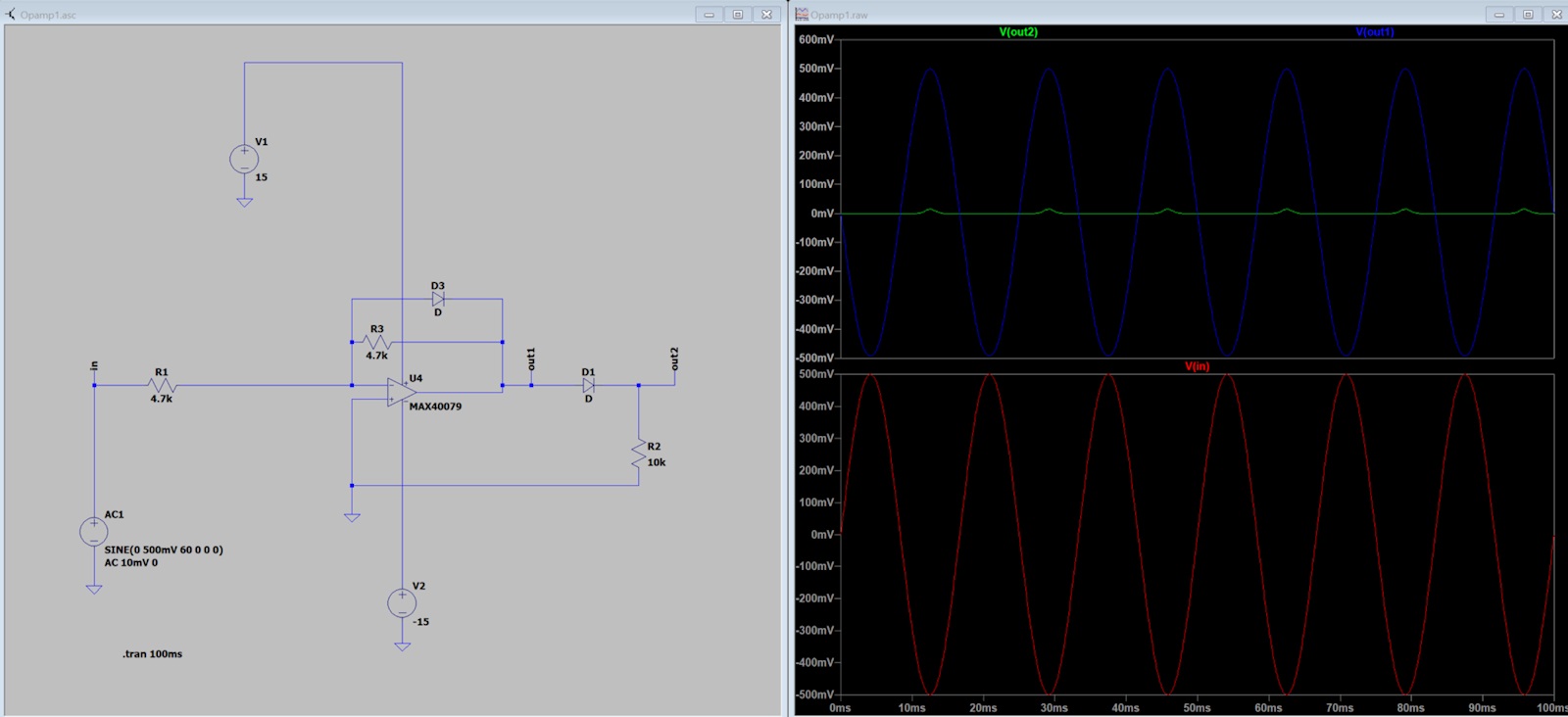 För negativa insignaler får vi positiva Uop och således en bakspänd D1. All utsignal återkopplas då i R. Räknar man på förstärkningen ser man att den blir 1 (-1) och Uop=-Uin=Uut. Fast detta gäller först då |Uin| > 0,7? Men så verkar det inte bli i simuleringarna. Hur kan D2 leda ström när Uop är ex 0,5?
