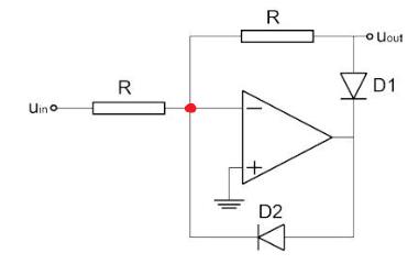 När inspänningen är positiv går strömmen som Jan Ragnars röda linje visar D1 leder utan spänningsfall och D2 spärrar,(tänk dig att den grenen inte finns i det fallet) U out = - Uin