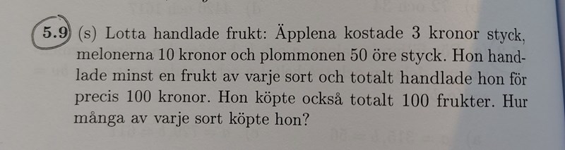 Är det en lösning du ser direkt? Jag tror jag är för dålig på aritmetik för att kunna se svaret direkt eller via såna slags resonemang... Finns det någon systematisk metod?