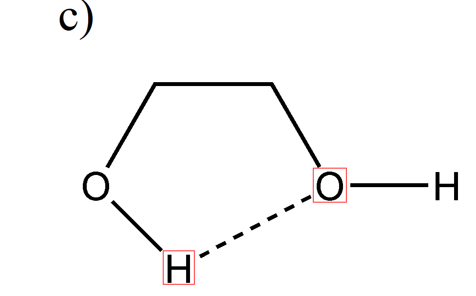 Generellt borde a) vara vanligare då hydroxigrupperna är längst ifrån varandra (mindre krockar och därmed lägre energi). Men, i formen b) kommer hydroxigrupperna så pass nära varandra, att det kan bildas en intramolekylär vätebindning mellan hydroxigrupperna. Frågan är om inte b) är mer stabil, genom denna extra vätebindning, i alla fall för en enstaka tänkt etylenglykolmolekyl "i vakuum".