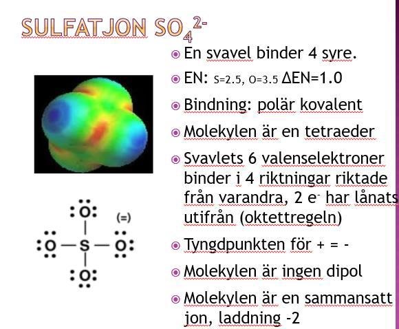 Men om man kollar på bilden på din sulfatjon så finns det ingen ände som har mer elektroner än en annan ände, det betyder att molekylens alla elektroner har fördelat sig över molekylen på ett sådant jämt sätt att molekylen inte kan betraktas som en dipol.