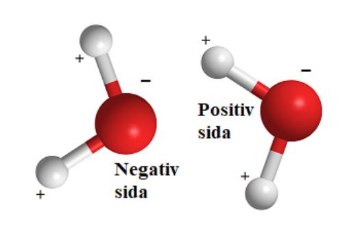 Groblix skrev:Ta t.ex. vattenmolekylen som är en osymmetrisk molekyl. Det sättet elektronerna ordnat sig på för att komma så långt ifrån varandra (repellera varandra) bidrar till en laddningsförskjutning hos hela molekylen. Pga. den polära kovalenta bindningen mellan väte och syre kommer en något mer positiv laddning äga rum på ena sidan av molekylen samtidigt som de två fria elektronpar som syrets två fria elektronpar kommer befinna sig på "andra sidan" av syreatomen. Laddningen blir alltså inte jämn fördelad över vattenmolekylen och då säger vi att den är osymmetrisk.