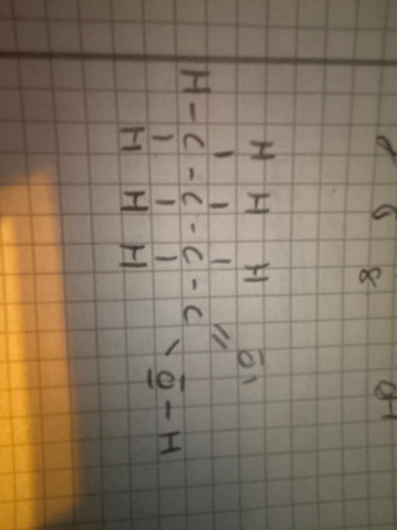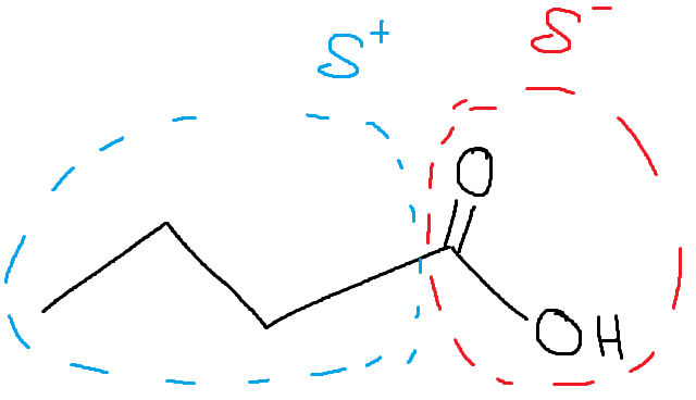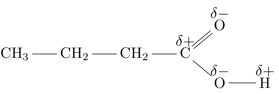 Uppgiften var: Rita en valfri molekyl som har summaformeln C4H8O2. Din ritade molekyl ska vara en dipol. Sätt ut δ+ och δ– på rätt ställe i din dipol.