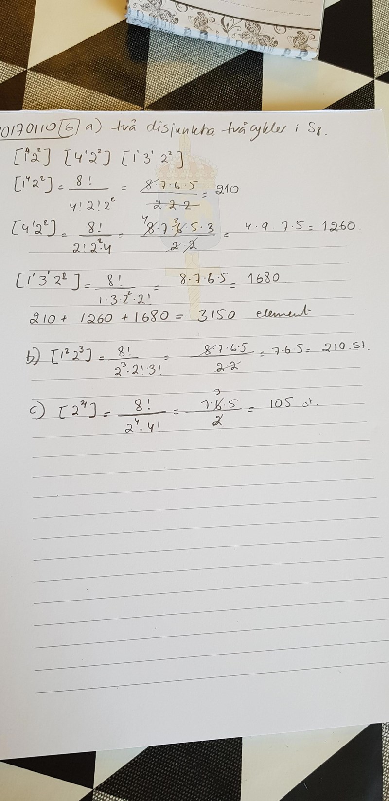 a) Hur många element i S8 (gruppen av permutationer av 8 element) kan