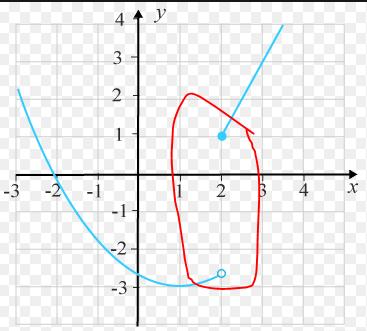 Hoppet innebär bara att funktionen, i just punkterna kring , inte är sammanhängande. Om x är nära två, men fortfarande mindre än två, går värdet av funktionen mot ca. -2,7, men om x är nära två och större än två, går värdet av funktionen mot 1.