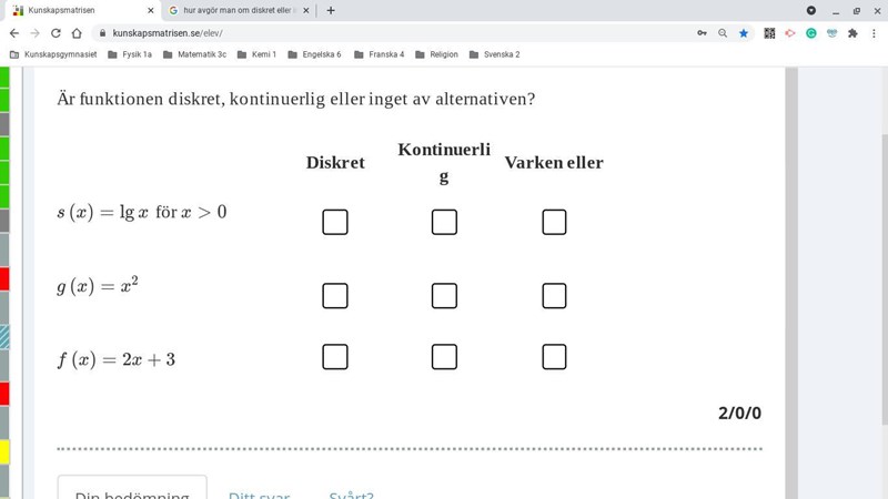 Jag vet hur man läser av i grafer men hur avgör man ifall det är en diskret eller kontinuerlig. De alla är kontinuerliga men hur räknar man eller tänker man ut det? Är det för att ingen måste bara ha heltal?