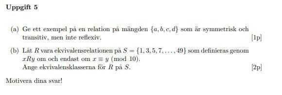 Jag vet faktiskt inte om det är a eller b uppgiften som inte stämmer. Men b känns rätt. Kan tänka mig att grafen på uppgift A är fel då det kanske var tänk att alla fyra punkter skulle vara med? Men jag tycker mitt resonemang håller. Hade svårt att veta hur jag skulle utforma grafen som symmetrisk och transitiv men inte reflexiv utan att utelämna någon punkt, skulle någon kanske kunna ge ett exempel på en sådan graf.