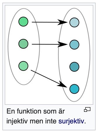 Wikipedia har följande bild som exempel / illustration av en funktion som är injektiv men inte surjektiv: