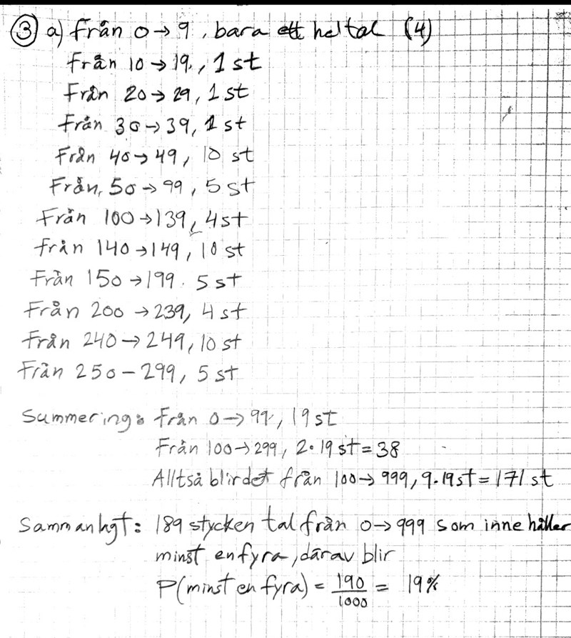 Alltså blir det stycken heltal som innehåller minst en fyra, i de tresiffriga heltal från till .
