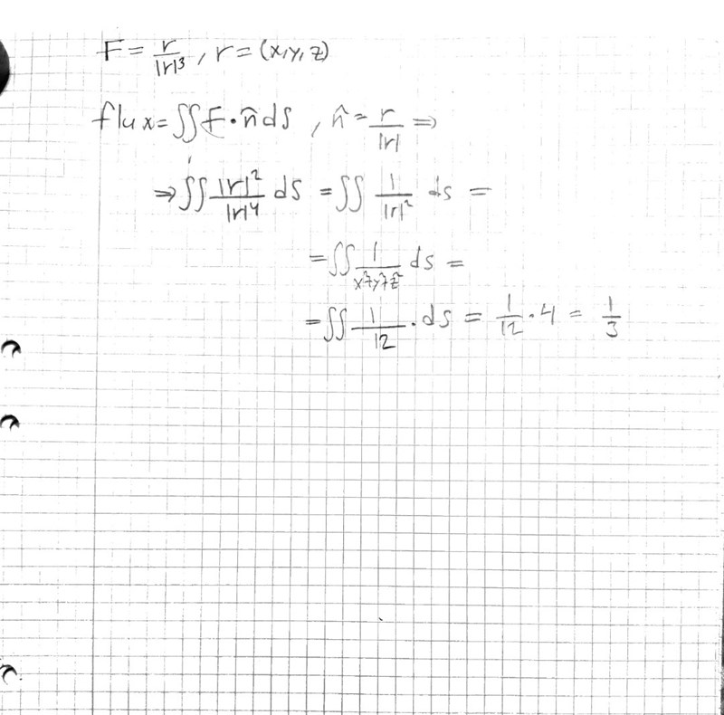 Eftersom divergensen är 0 (eller hur?) i volymen mellan sfär och kub så flödar det ut (genom kuben) lika mycket som det flödar in (genom sfären). Alltså är din sökta flödesintegral ...