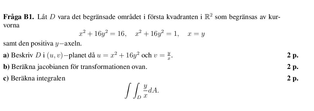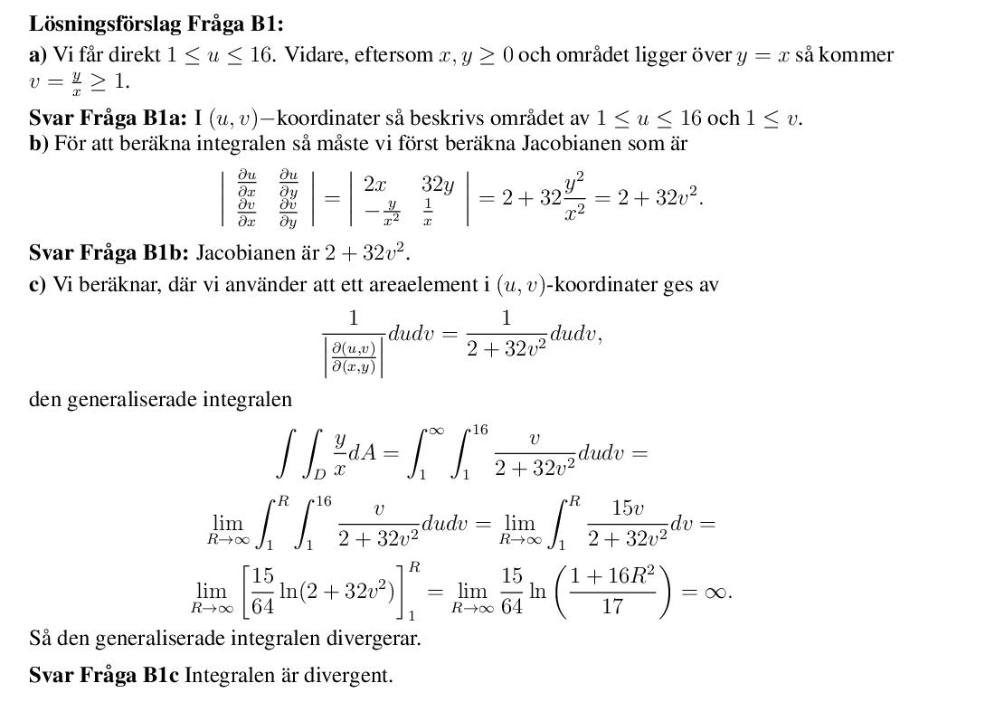Jag tänker att motsvaras av , vilket stämmer. Det jag tänkte sedan var att eftersom den positiva y-axeln begränsar området, så borde det gälla att . Detta stämmer däremot inte överrens med lösningsförslaget, som endast använder att och får således integralen till divergent. Jag förstår att något är fel med mitt resonemang att , jag försöker bara visualisera hur det är fel (det resonemanget ger nämligen en konvergent integral). Lösningsförslag samt uppgift nedan: