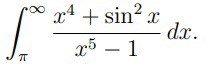 Tomten skrev:-1<=sin2 x<= 1 för alla x. Den kan inte gå mot oändligheten. Eftersom gradtalsskillnaden mellan täljare och nämnare = 1 så tror jag du ändå har rätt att integralen är divergent. Bryt ut x4 och förkorta mot täljaren. Uppskatta sedan integranden nedåt för att visa divergens.