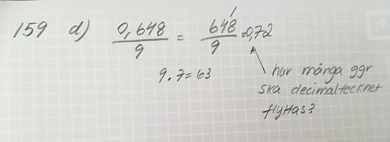 Jag försöker lära mig mer om division med decimaltecken. Jag förstår inte hur många ggr decimaltecknet ska flyttas? Enligt boken så ska man förenkla från 0,648 till 648 men svaret sedan blir inte rätt. Rätta svaret ska bli 0,072
