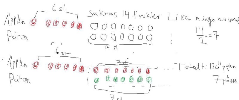 Kanske så här: ta de extra sex äpplena och lägg undan dem. Då är det 14 frukter kvar, och det är lika många äpplen som päron, alltså sju äpplen och sju päron. Med de sex äpplena som vi lade åt sidan blir det 13 äpplen.