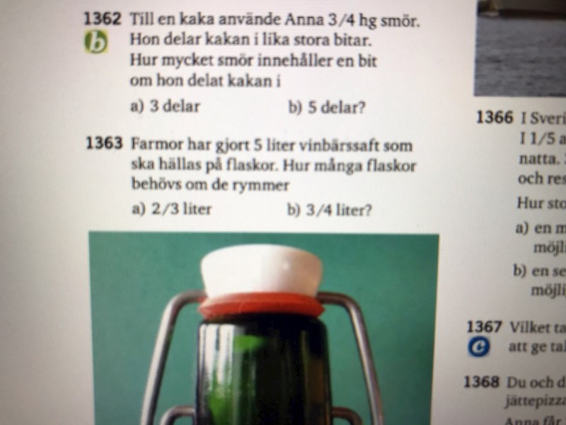 hej, på fråga 1363 a) har jag skrivit följande = 5 / 2/3 = 5x3/1x2 = 15/2 = 7,5 (7 och en halv flaska). på matte boken säger facit att svaret är 8 flaskor. Har jag gjort ett fel eller har facit avrundat uppåt alternativt gjort något annat för att få fram ett annat svar