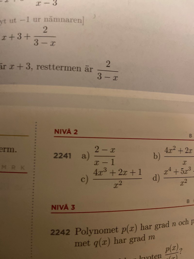 Hej, på den här frågan får jag fram att svaret är kvot:-1 och restterm (-1)/(x-1) (uppgift 2241 a)