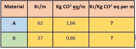 Jag behöver räkna ut kostnaden per kg CO2 eqvivalenter per meter, för två material: