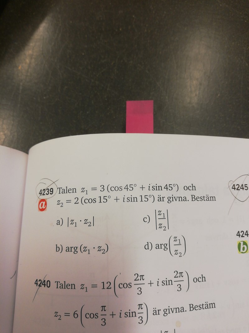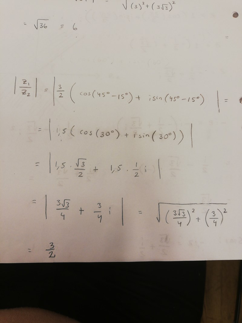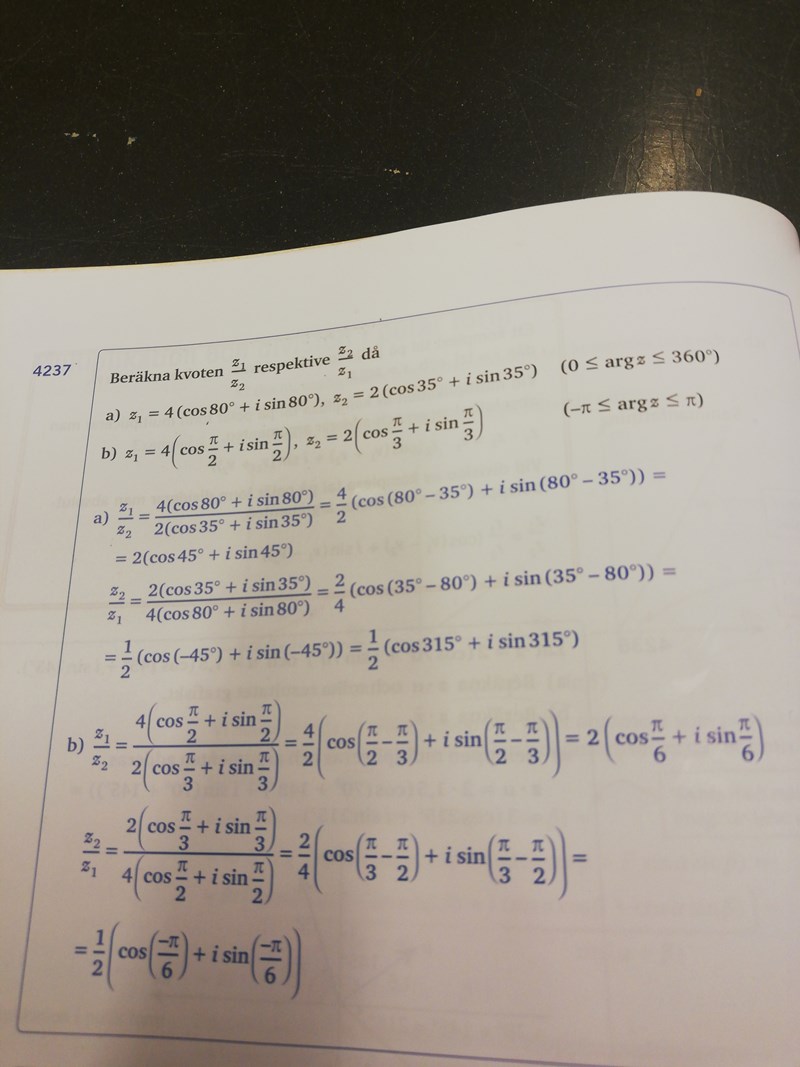 Uppgift 4239 c). Undrar om man kan lösa division med polär form som jag har gjort eller om man måste göra som de i boken i ett exempel, dvs skriva de täljaren och nämnaren och sen använda minus av vinklarna?