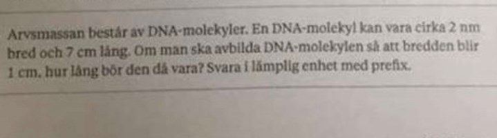 Arvsmassan består av DNA-molekyler. En DNA-molekyl kan vara cirka 2 nm bred och 7 cm lång. Om man ska avbilda DNA-molekylen så att bredden blir 1 cm. Hur lång bör den då vara? Svara i lämplig enhet med prefix.