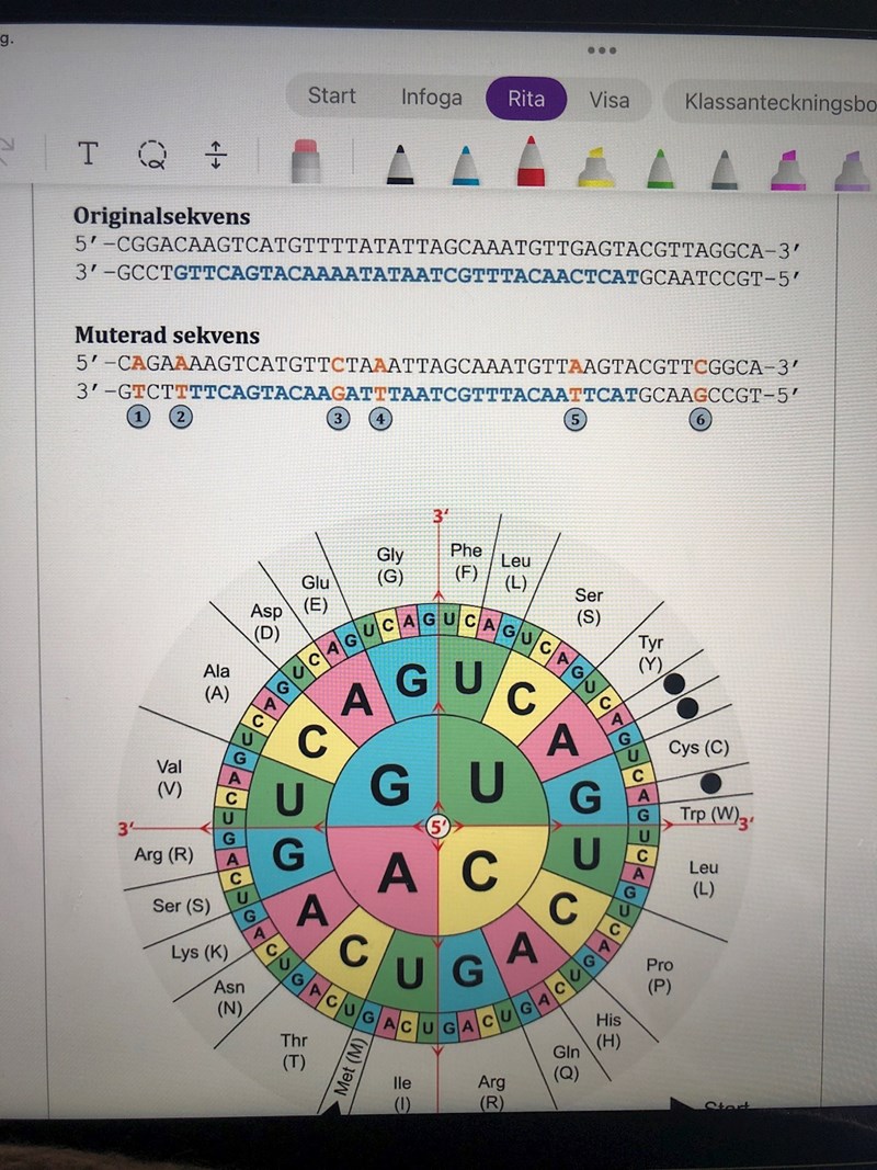 Nedan ser du en DNA-sekvens där gensekvensen är markerat i blått. Denna sekvens har fått sex mutationer (1-6, markerat i orange). Vilken mutation är troligen mest skadlig för cellen och motivera varför det är så?