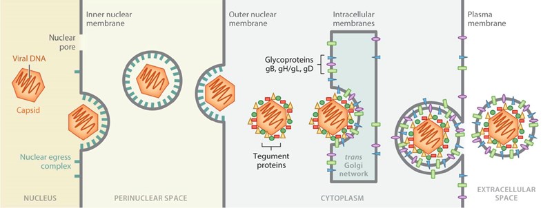 Detta sker t.ex. för herpesvirus, som i bilden nedan från insidan av kärnan till vänster, via cytoplasman och Golgi till utsidan av cellen till höger.