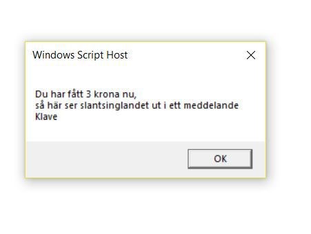 WScript.Echo('Du har fått ' + krona + ' krona nu,\nså här ser slantsinglandet ut i ett meddelande\n' + slant);