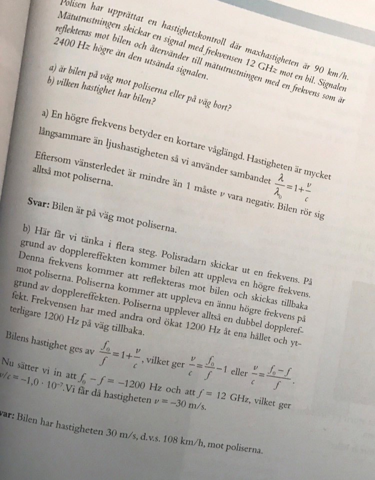 b) uppgiften förstår jag inte heller, jag hänger med på allt tills "Frekvensen har ökat med andra ord 1200hz åt ena hållet och ytterligare 1200 HZ på väg tillbaka." Vad menar de med hållen? Är det inte så att först skickar det 12GHz och när den är tillbaka så är det en frekvens som är 2400 Hz högre än den utsända signalen.