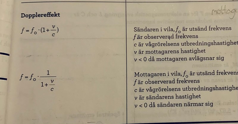Hej jag har en uppgift där man ska använda formlerna för dopplereffekten för att lösa ut frekvensen/våglängden för den ton som observatören hör. Problemet är att i min formelbok så finns det 2 formler: en för när sändaren är i vila och en för när mottagaren är i vila.